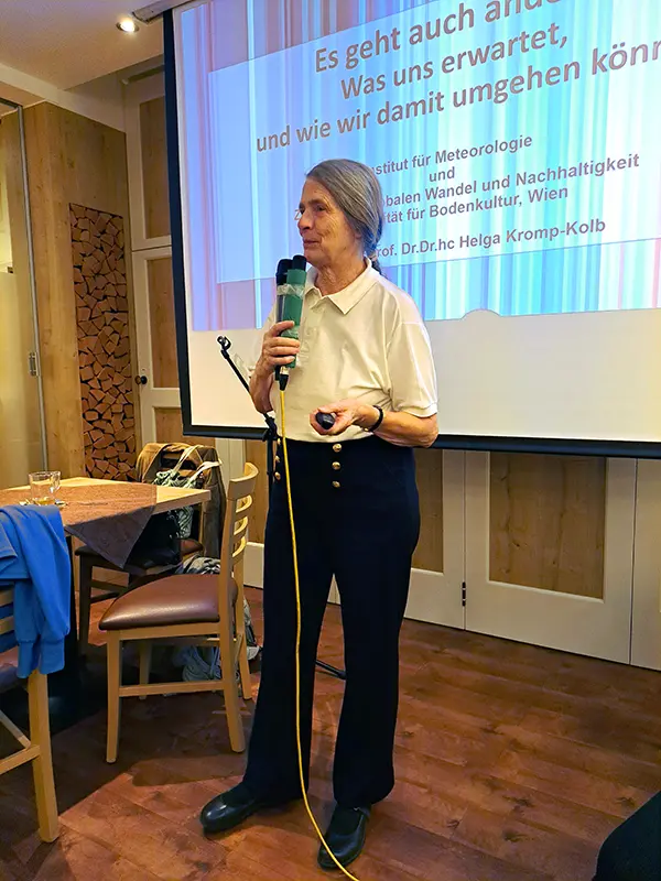 Es geht auch anders – was uns erwartet und wie wir damit umgehen könnten Gemeinsam mit der Stadtgemeinde Bad Leonfelden deshalb zum weitläufigen Thema Klima und Energie am Dienstag, 4. November um 18.30 Uhr im Gasthof Leonfeldner-Hof in Bad Leonfelden einen Impulsvortrag von em. o. Univ. Prof. Dr. Dr. h.c. Helga Kromp-Kolb. Die weltweit renommierte Klimaforscherin belehrt nicht, sie bringt Fakten, leuchtet Hintergründe aus und erklärt Zusammenhänge. Inwieweit hat die Was kosten uns die einzelnen Szenarien? Welche Eigendynamik hat sich bereits entwickelt? Auch die Möglichkeit im Anschluss für Fragen und eine Diskussion wurde vom Publikum reichlich genutzt.